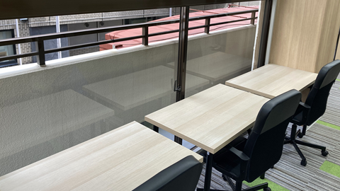 窓際の明るいエリアの席で気分転換に外を見ながら。
